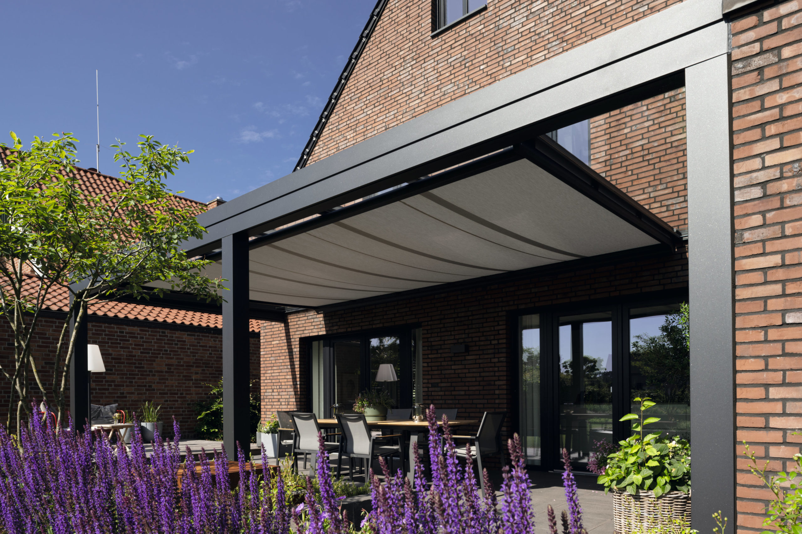 Die senkrechte ZIP-Markise schützt auch vor seitlicher Sonneneinstrahlung und ist in vielen Farben und Textilien erhältlich.